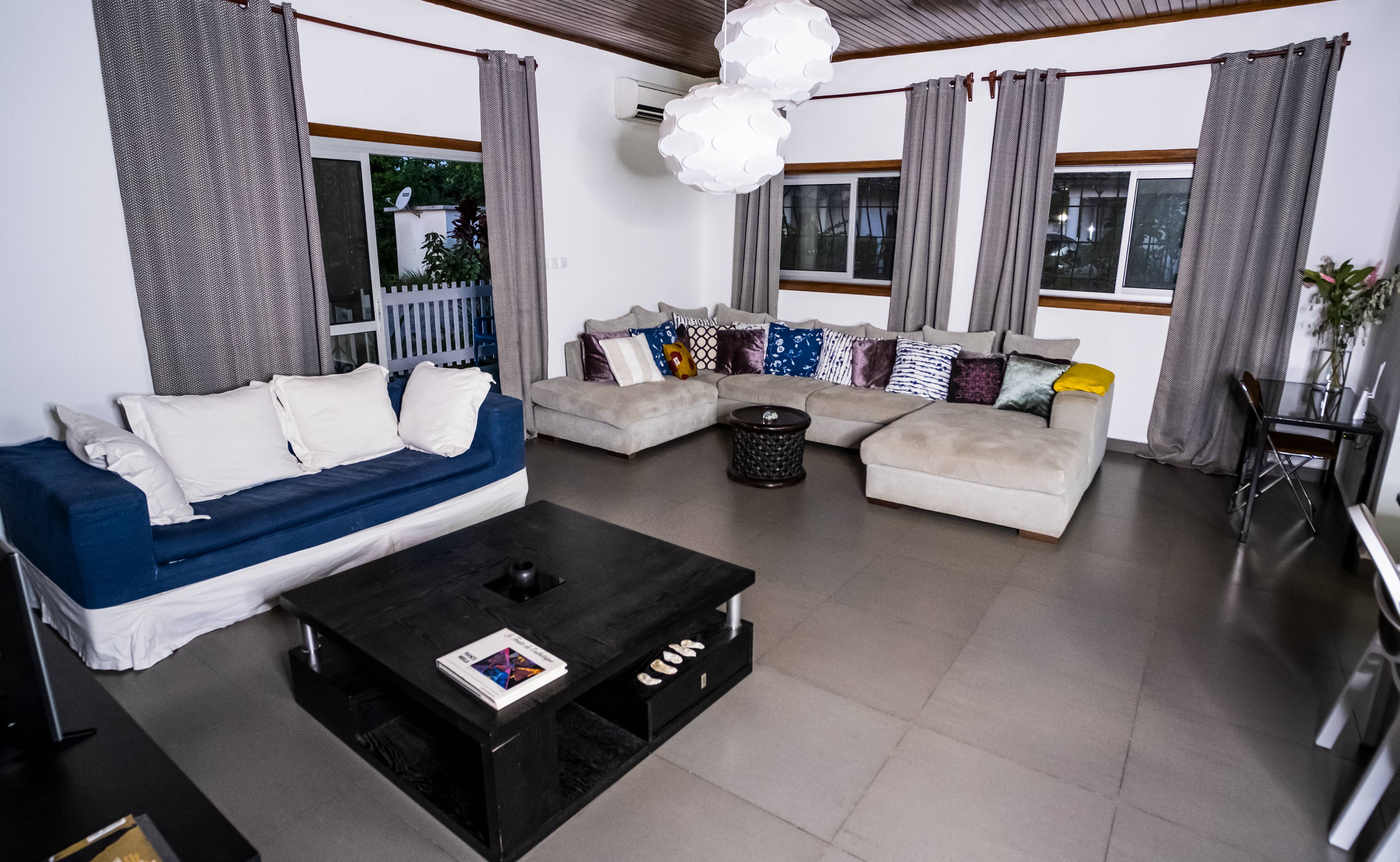 Située en bordure de mer dans la ville de kribi, pour vos longs, moyens et courts sejours, Villa 3 chambres, 2 salles de bains, 1 salon + salle à manger 1 cuisine (Frigo + congélateur + micro ondes + machine à café+ four et Gazinnière) Climatisation wifi gratuit parking privé camp securisé groupe électrogène