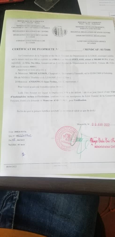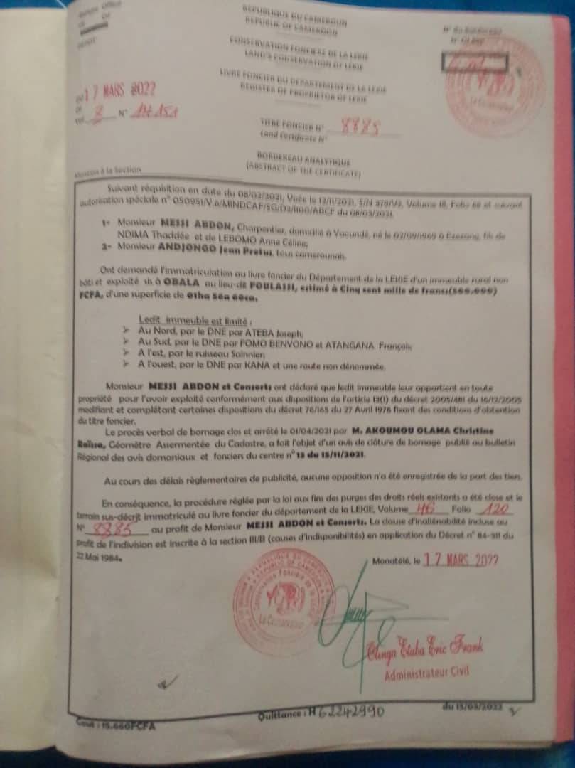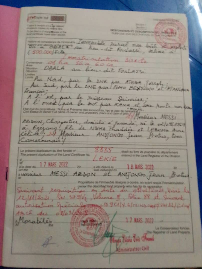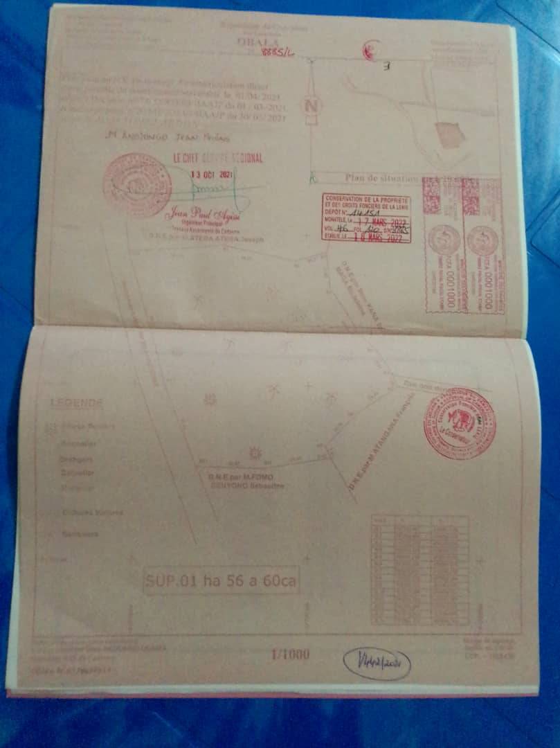 terrain titré à vendre à l'entrée de la ville d'Obala au quartier Foulassi le site est à 800m de l'axe principal un site idéal pour de grands projets comme une usine, un institut, une école, un hôtel , un site touristique etc